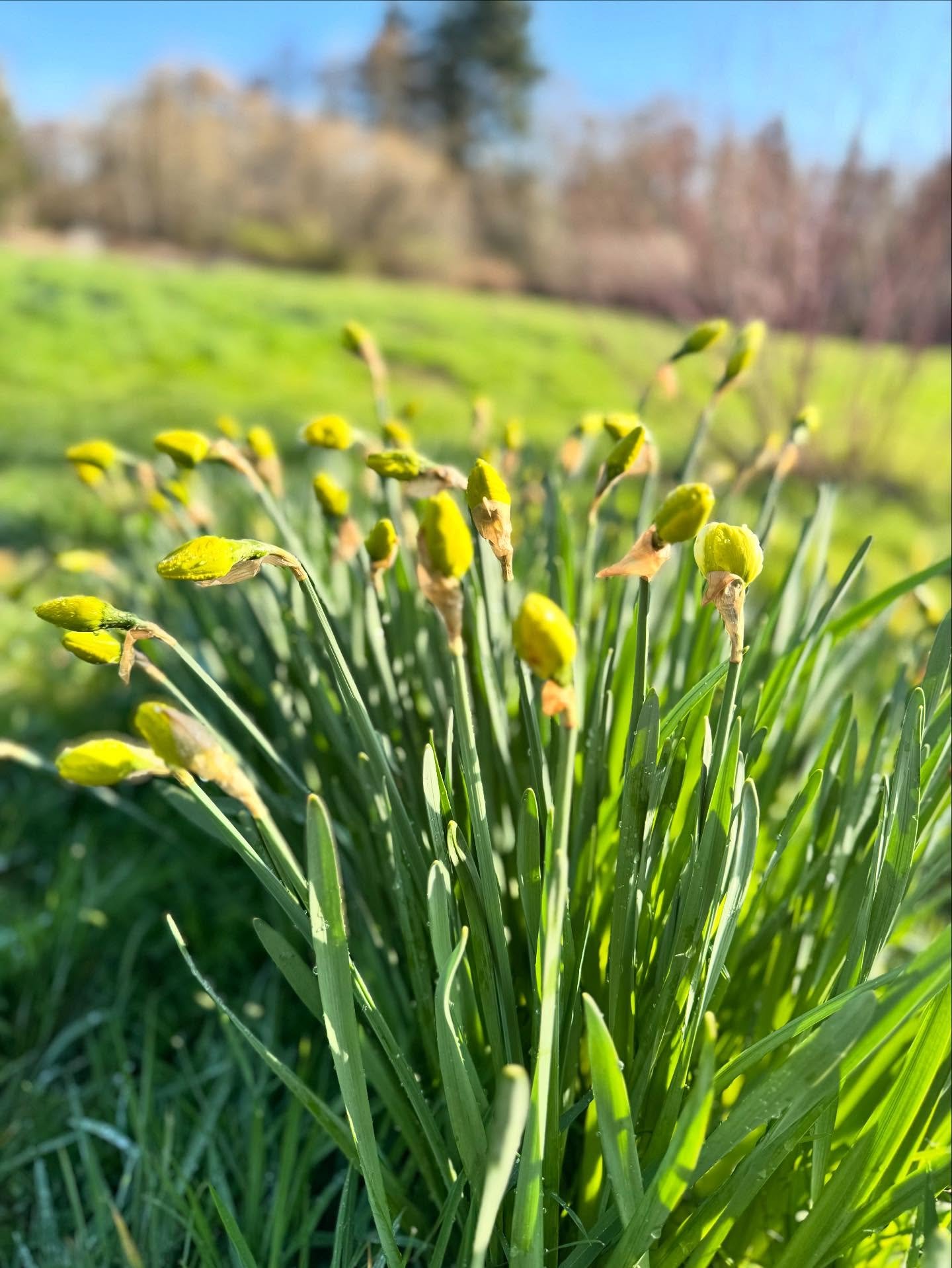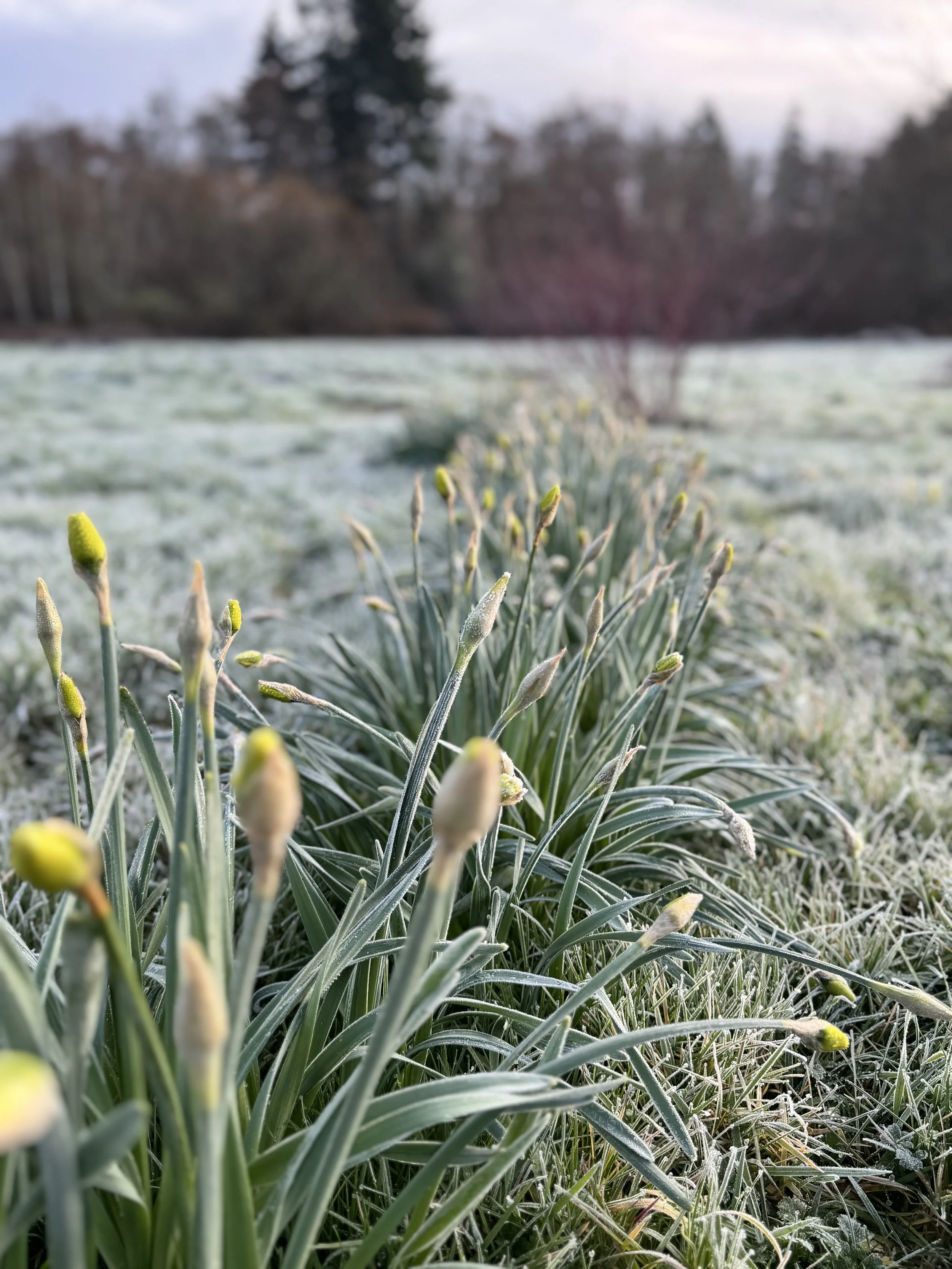 Daffodils and tulips are starting to emerge, while spring plants and starts are growing like mad in the greenhouse.