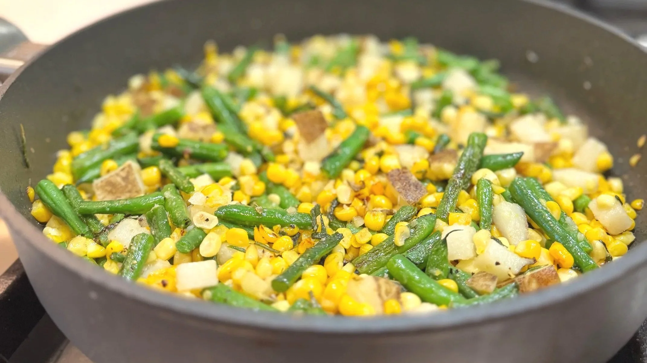 3. Add green beans and corn kernels to the skillet; sauté until tender and slightly caramelized, about 6-8 minutes.